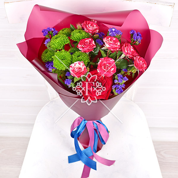 Роза красная– 1 шт., роза красная кустовая– 1 шт., хризантема зеленая– 1 шт., статица фиолетовая – 1 шт., упаковка, лента.