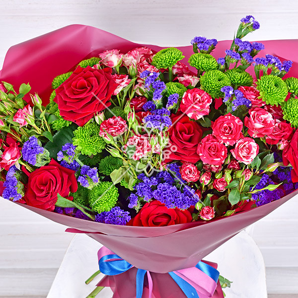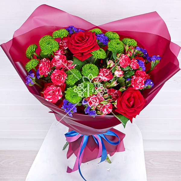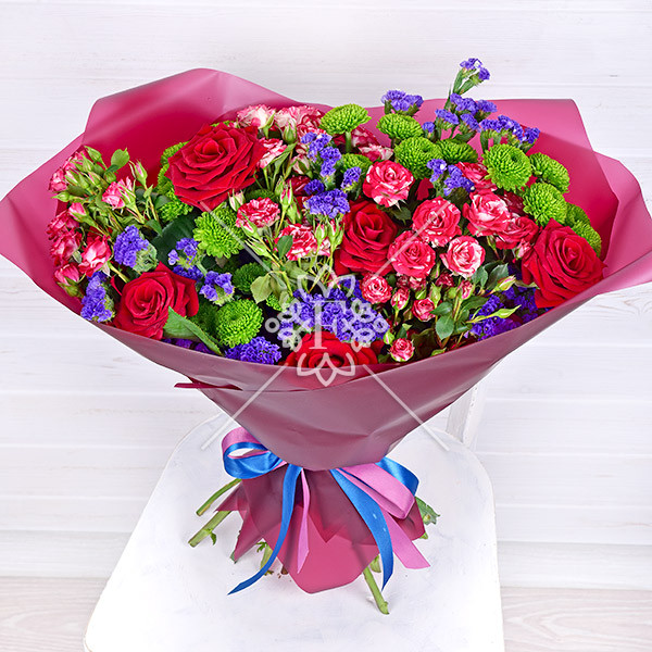 Если Вы планируете удивить любимого человека, подарить свое внимание и нежность, обратите внимание на прекрасный букет «Магия любви». Классические алые и кустовые розы созданы для романтических признаний, зеленые хризантемы дарят нежность и восторг, а невесомая фиолетовая статица подчеркивает композицию.