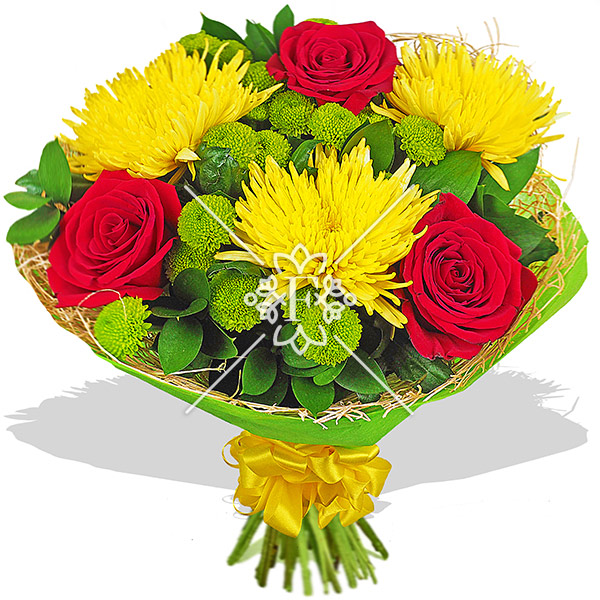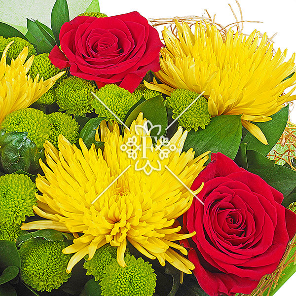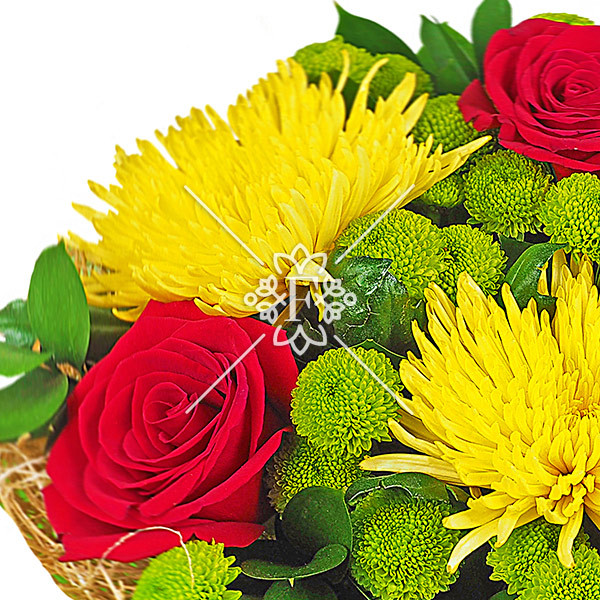 Хризантема- символ радости и богатства, представлена в этой цветочной композиции в желтом и зеленом цвете, а королева цветов –красная роза , говорит об искренних и возвышенных чувствах, это символ теплоты расположения!